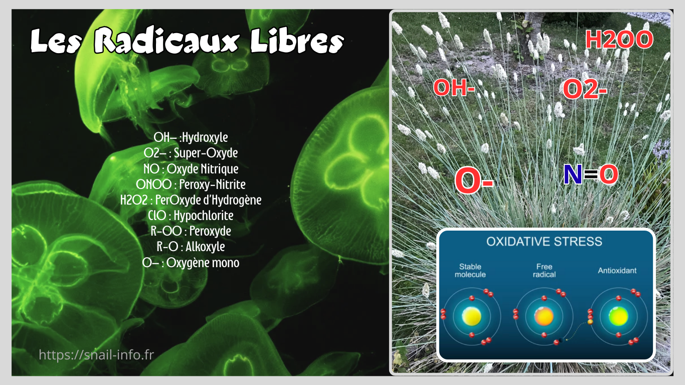 Un radical libre est une espèce chimique (atome ou molécule) qui possède un électron célibataire, c’est-à-dire non apparié. Cette caractéristique le rend instable et lui procure une grande réactivité vis-à-vis des molécules environnantes. Un radical libre se stabilise au détriment de la molécule voisine qui devient à son tour un radical libre et ainsi de suite. Le phénomène se propage par des réactions en chaîne. Lorsqu’elle se produit dans l’organisme, cette réaction en chaîne est communément appelée le stress oxydant. Ces fragments sont des produits très réactifs et sont issus des molécules organiques, ils portent le nom des dérivés réactive de l’oxygène, les ROS, ils sont libérées naturellement dans l’organisme du vivant suites à divers processus biochimique in vivo lors du métabolismes, pendant la glycolyse par exemple, malheureusement, ces sous-produits ne sont pas sans conséquence dans le vieillissement induite des cellules, car ils sont précurseurs et producteurs des ROS, tel que l’oxygène singulet, responsable du vieillissement cellulaires prématurés, L’inflammation et prédisposition à certains cancers.