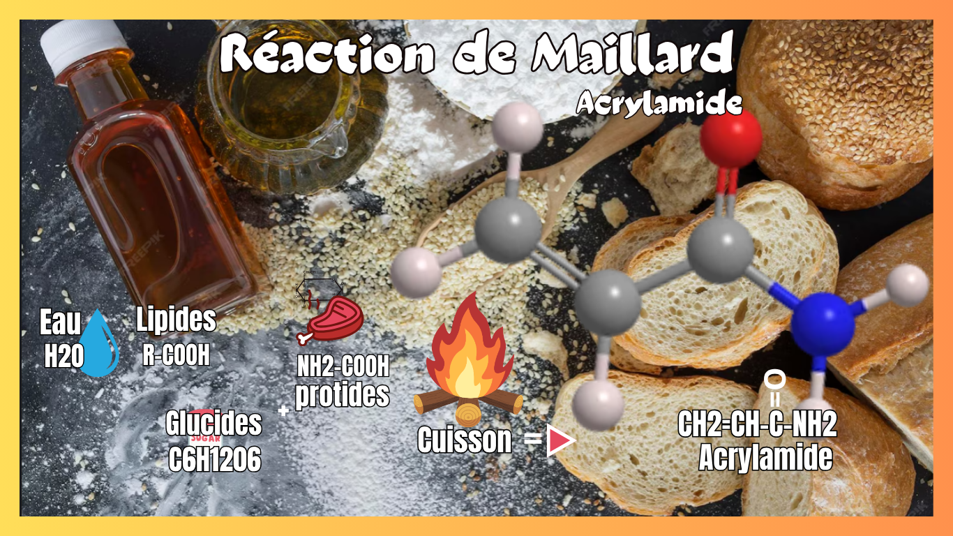 L’acrylamide est le produit de la réaction de Maillard, c’est une substance cancérigène, neurotoxique et reprotoxique, qui se forme dans les aliments riches acides aminés, tel que, l’asparagine avec des produits sucrés comme l’amidon. Lors des processus de cuisson à haute température supérieure à 120 °C, tels que la friture, l’exposition à haute température de rôtissage. Celle-ci se retrouve dans des produits tels que les chips de pomme de terre, les frites, le pain, les biscuits ou encore le café. L’acrylamide est un sous-produit de la réaction courante, dans laquelle les sucres réducteurs, c’est-à-dire le fructose et le glucose interagissent avec les protéines. Sur la base des preuves de la cancérogénicité de l’acrylamide chez les animaux, le Centre international de recherche sur le cancer a classé l’acrylamide (AA) dans le groupe 2A des substances cancérogènes pour l’homme.