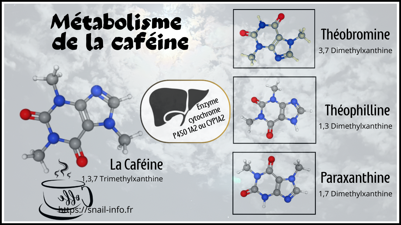 Les Diméthylxanthines sont les produits du métabolisme issus de la Triméthylxanthine, présente certaines végétaux, tel que, le café, le thé vert et le cacao. Après absorption d’une tasse de café, son métabolisme est systématiquement géré par les cellules du foie. Les Diméthylxanthines sont des structures chimiques des xanthines faisant partie des composés bioactifs du café. La caféine (1,3,7-triméthylxanthine) subissant une dégradation par une enzyme cytochrome 450p, de type (Cyp1A2) dans les hépatocytes du foie et donne naissance à trois composés secondaires, tels que: