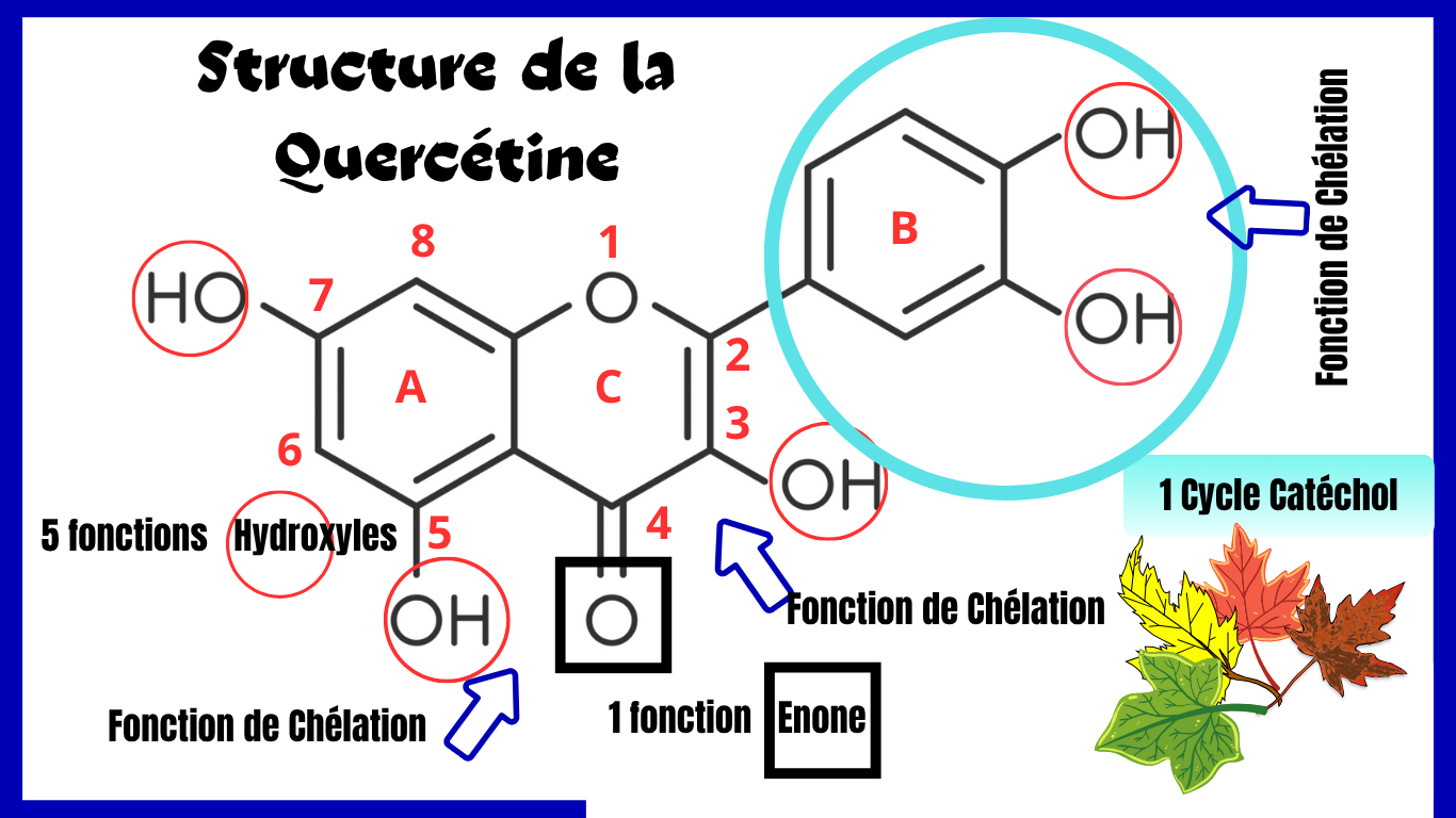 La quercétine, un flavonoïde présent dans les fruits et les légumes. La quercétine appartient à un groupe de pigments végétaux appelés flavonoïdes, les couleurs visibles au rythmes des saisons sur les feuilles, les fleurs, les fruits et les légumes. Le vert de la chlorophylle, jaune orangé de la carotène, le jaune de la xanthophylle et le marron de l’anthocyane. Les relations entre la structure et les activités des flavonoïdes comme la quercétine résident dans les éléments structuraux nécessaires à l’obtention d’une activité antioxydante. De nombreuses études ont mis en évidence l’existence de relations structure-activités dans le cas des flavonoïdes. Ainsi, il a été démontré que leurs activités et de leurs métabolites dépendent essentiellement du nombre et de la position de leurs groupements fonctionnels nécessaires à l’obtention d’une activité antioxydante optimale. La présence d’une fonction catéchol sur le cycle B, par définition, un catéchol est une substance incolore, très oxydable, dérivés de la catéchine et on parle souvent de dérivés catéchiques. La présence de fonctions phénol pour dire catéchol et la présence d’un groupement hydroxyle en position 3 et un motif énone au niveau du cycle C.