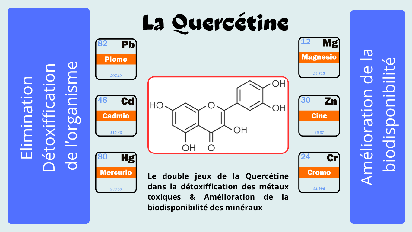 La chélation a pour but capter des métaux lourds nocifs, tels que le plomb, l’arsenic, ou encore le mercure et le cadmium. Des agents chélateurs, comme l’EDTA – Éthylène Diamine Tetra-acétique par exemple, sont prescrits afin de se lier aux métaux lourds dans l’organisme. Dans les compléments alimentaires, au même titre de la Quercétine, c’est un chélateurs qui va former un complexe stable, inactif, non nocif et soluble, pour ensuite être excrété et éliminer par les reins. Ce traitement chélateur va permettre la diminution des toxiques et leurs taux sanguins et tissulaires.