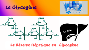 Le glycogène est un glucide complexe présent dans le foie et les muscles, cette grosse molécule stocke de l’énergie de réserve pour être utiliser durant une période de jeune, par exemple. Le glycogène se constitue de plusieurs molécules de glucose liées entre elles, sa structure lui donne la propriété de pouvoir libérer rapidement des molécules de glucose dans le sang et peut alors rapidement fournir de l’énergie aux muscles lors d’un effort physique.