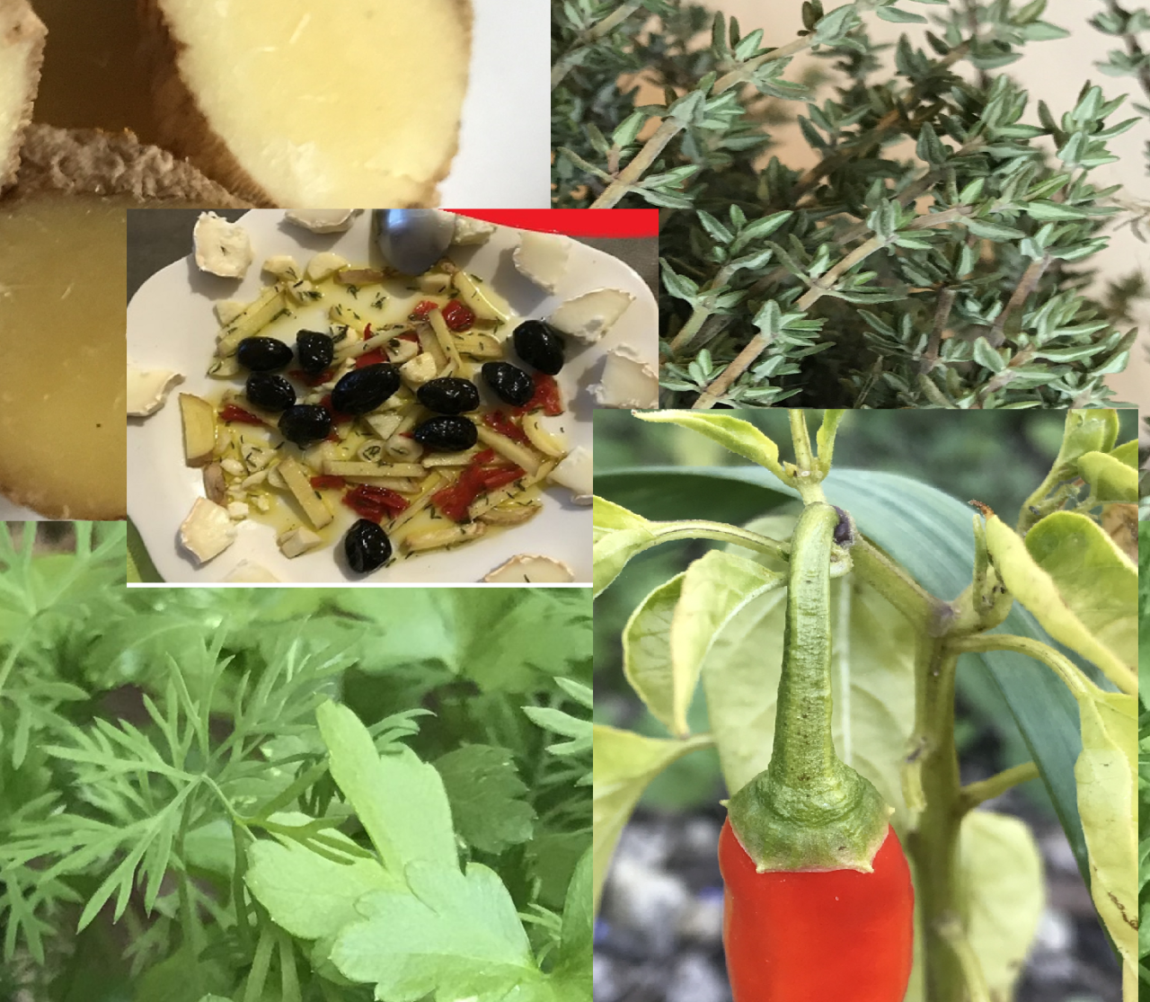 Découper le gingembre, les gousses d’ail, le piment on rondelles fines et puis en petits bâtonnets et verser la préparation dans un petit saladier. Ajouter le thym, le persil et arroser généreusement à l’huile d’olive. Mélanger la préparation et laisser reposer pour activer la biochimie Préchauffer le pain au four ou à la grille (Grille-pain) Découper le fromage de chèvre en rondelles. Garniture: Disposer la préparation dans un plat et ajouter un peu d’huile d’olive s’il en faut. Garnir avec les olives au tour en alternant avec les tranches de fromage de chèvre et les tomates cerise.